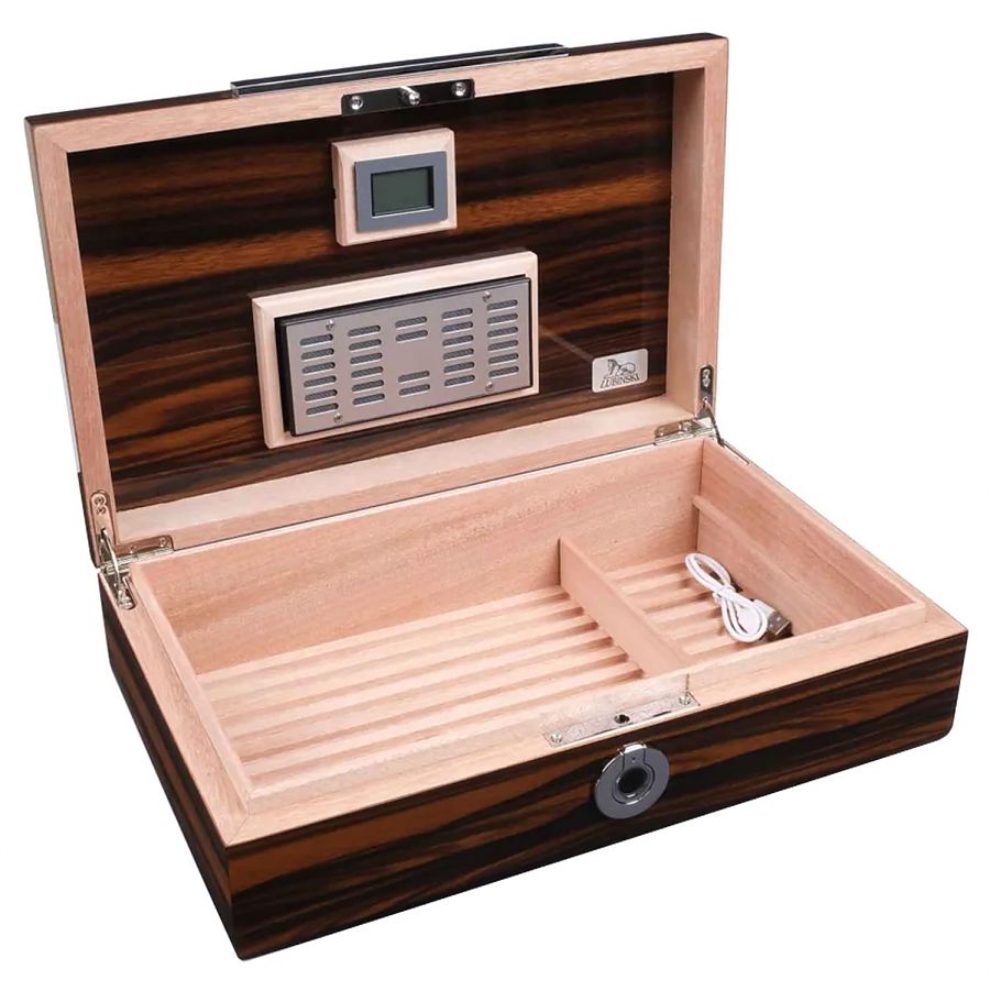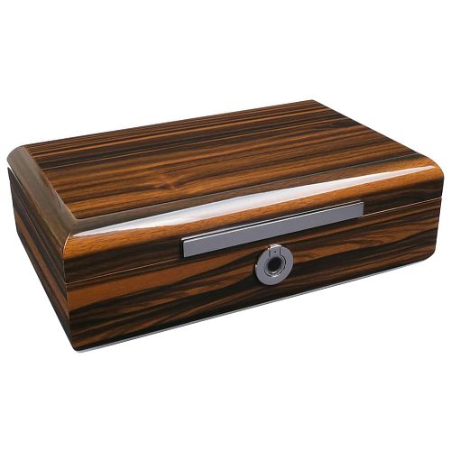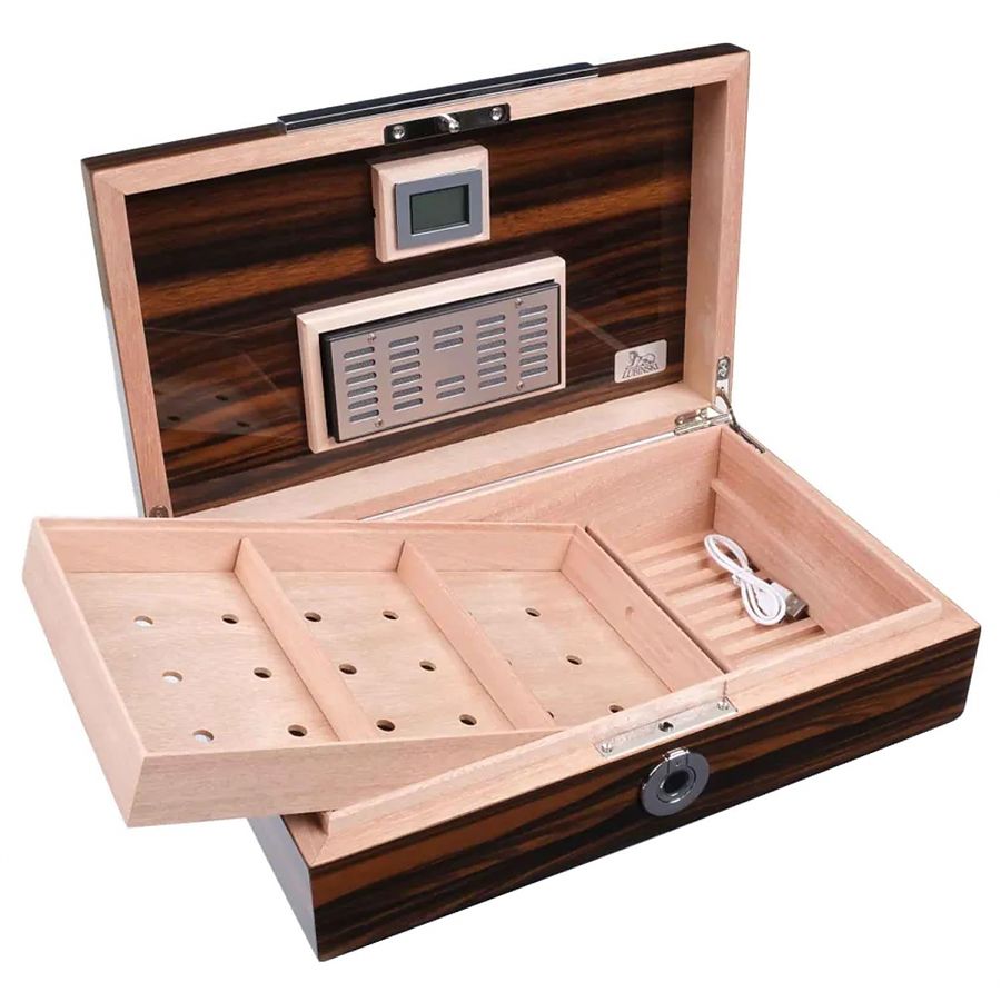 Модель на 60 сигар с электронным замком. Хьюмидор в строгом классическом дизайне с отделкой из испанского кедра и эбенового дерева. Оборудован вентиляционной решеткой, съемным лотком и перегородками для лучшей циркуляции воздуха и равномерного увлажнения сигар без «сухих и мокрых зон». В коплект входит высокоточный, электронный гигрометр и увлажнитель с акриловым полимером нового поколения.
