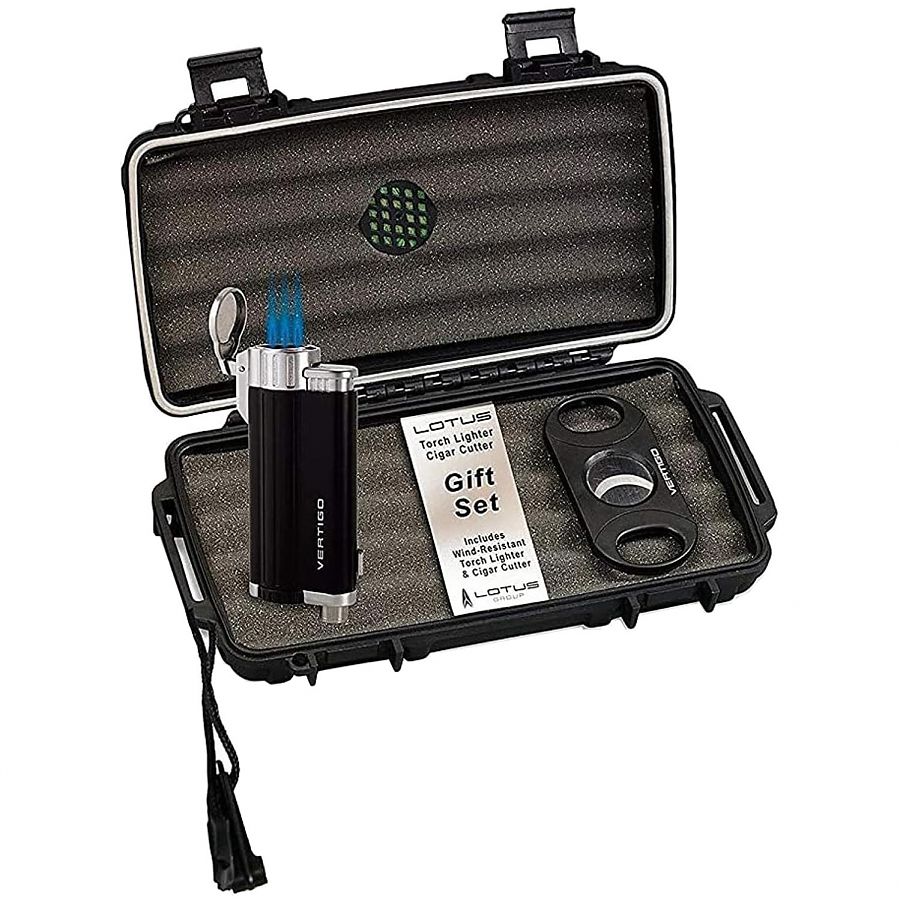 В набор входят: Хьюмидор Lotus Travel, гильотина для сигар Lotus и зажигалка Lotus Vertigo Triple Flame Torch.