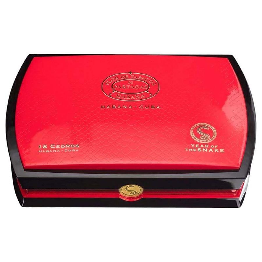 Habanos S.A. ежегодно выпускает сигары, вдохновлённые символами китайского зодиака. Partagas Cedros – это эксклюзивная коллекция, повященная году Деревянной Змеи и 180-летнему юбилею легендарного бренда. Витола представленна формате Robusto Extra 135 мм x 50. Созданы полностью вручную из цельных, прошедших тщательный отбор, листьев, выращенных на лучших полях плантаций Сан-Хуан-и-Мартинес и Сан-Луис в регионе Вуэльта-Абахо провинции Пинар-дель-Рио.
