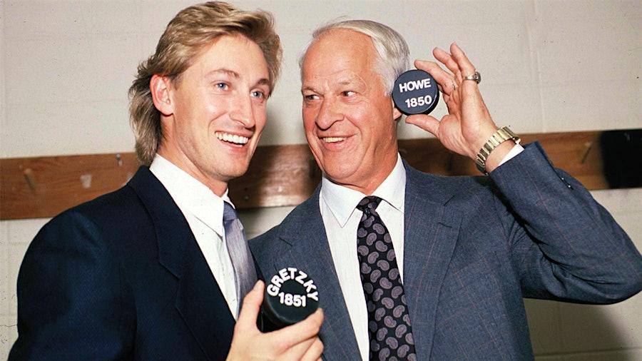 Гретцки с хоккейной легендой Горди Хоу в тот день, когда он побил рекорд Хоу по количеству набранных очков