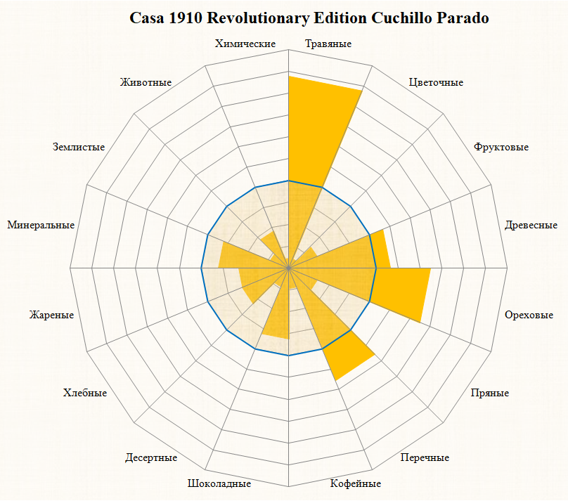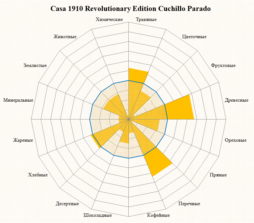 Третья треть: сено, миндаль, дуб, черный перец, карамель, сдоба, кофейные зерна, кожа